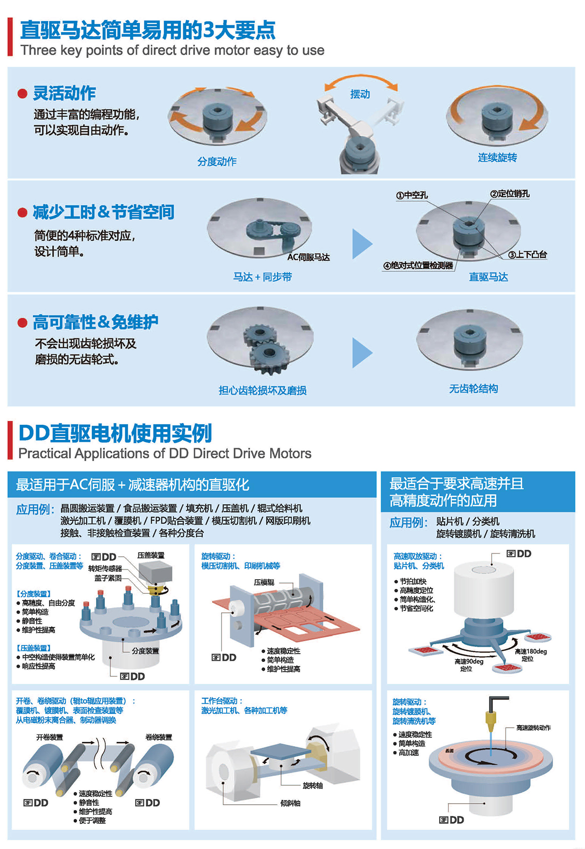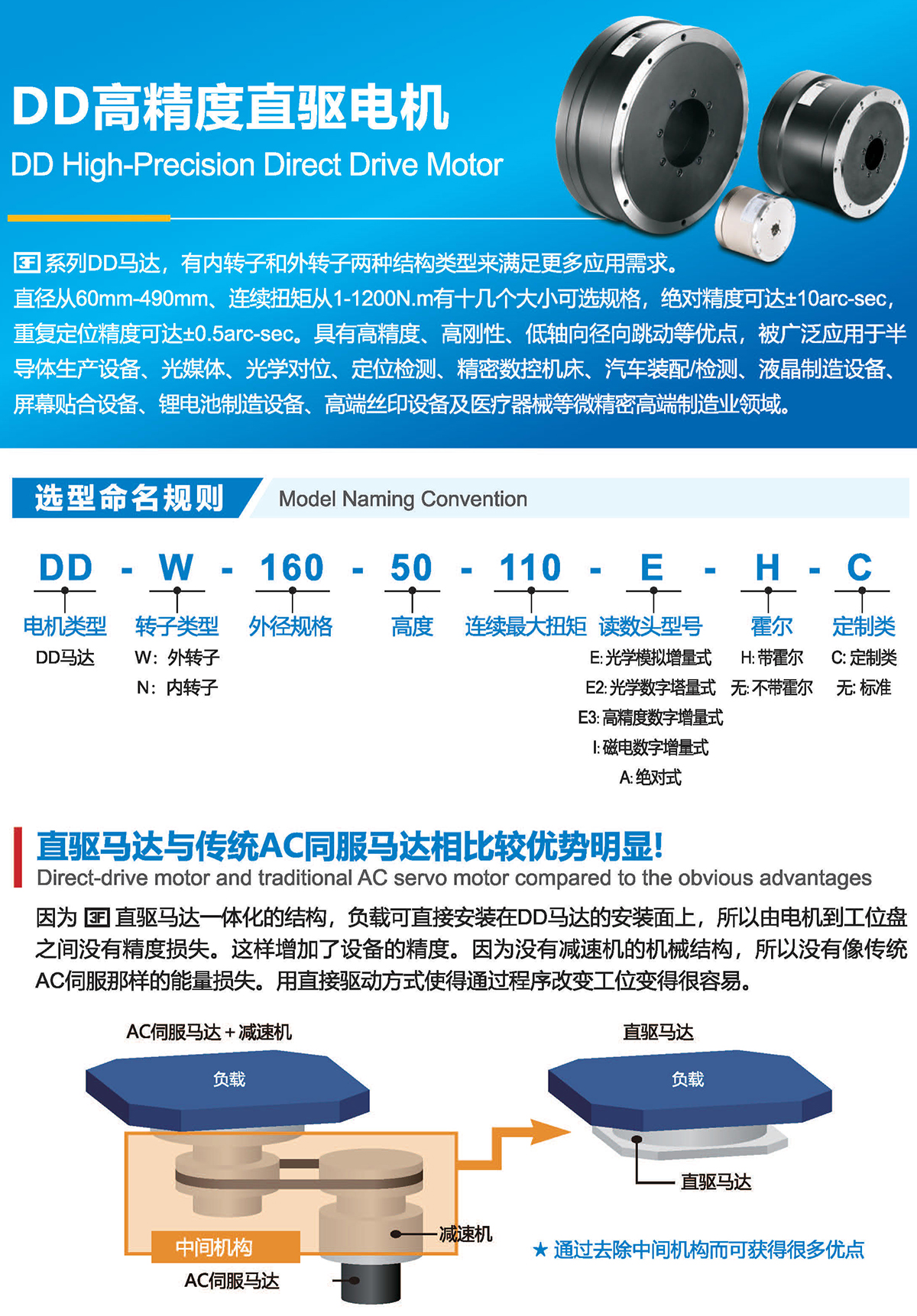 直径从60mm-490mm、连续扭矩从1-1200N.m有十几个大小可选规格,绝对精度可达±10arc-sec,重复定位精度可达0.5arc-sec。具有高精度、高刚性、低轴向径向跳动等优点,被广泛应用于半导体生产设备、光媒体、光学对位、定位检测、精密数控机床、汽车装配检测、液晶制造设备、屏幕贴合设备、锂电池制造设备、高端丝印设备及医疗器械等微精密高端制造业领域.