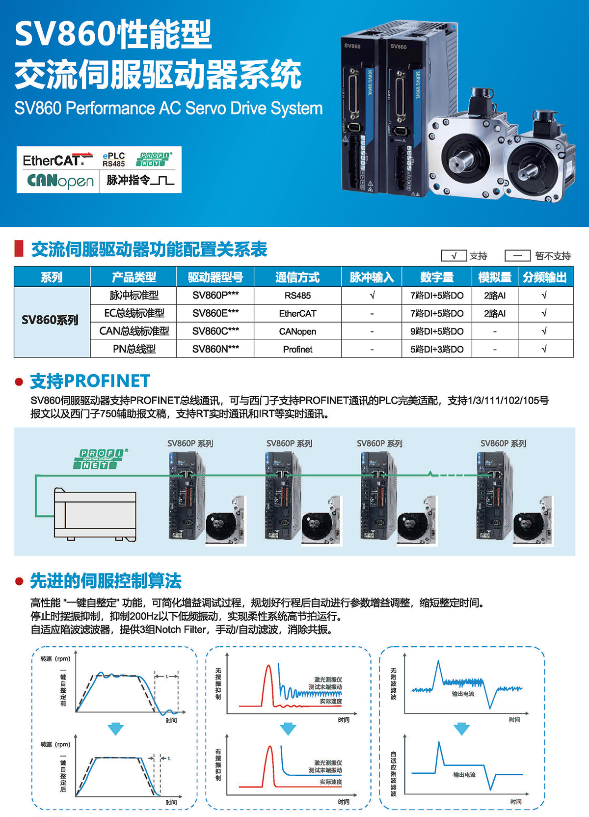高性能"键自整定"功能,可简化增益调试过程,规划好行程后自动进行参数增益调整,缩短整定时间。停止时摆振抑制,抑制200Hz以下低频振动,实现柔性系统高节拍运行。自适应陷波滤波器,提供3组Notch Filter, 手动/自动滤波,消除共振。