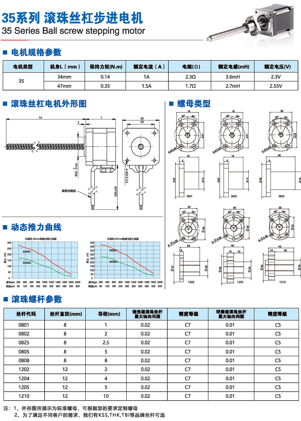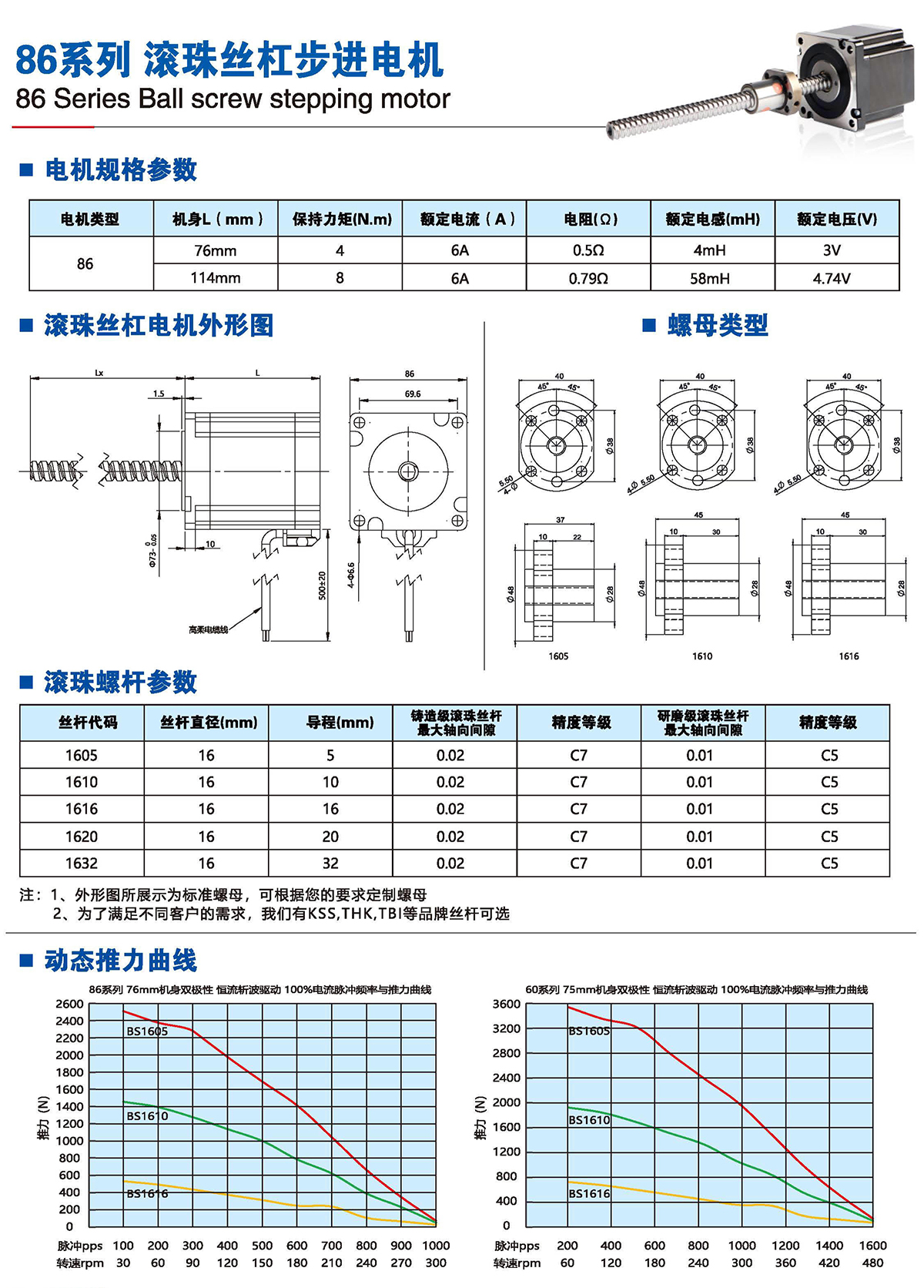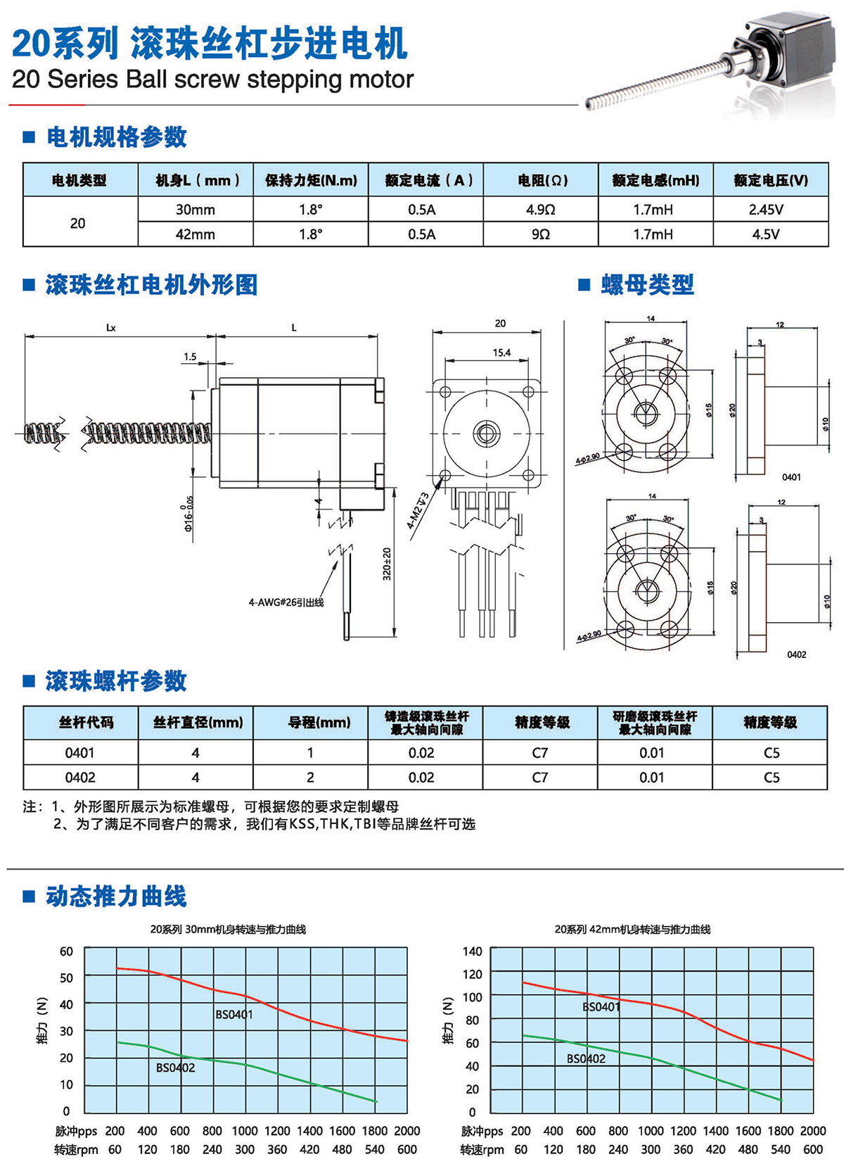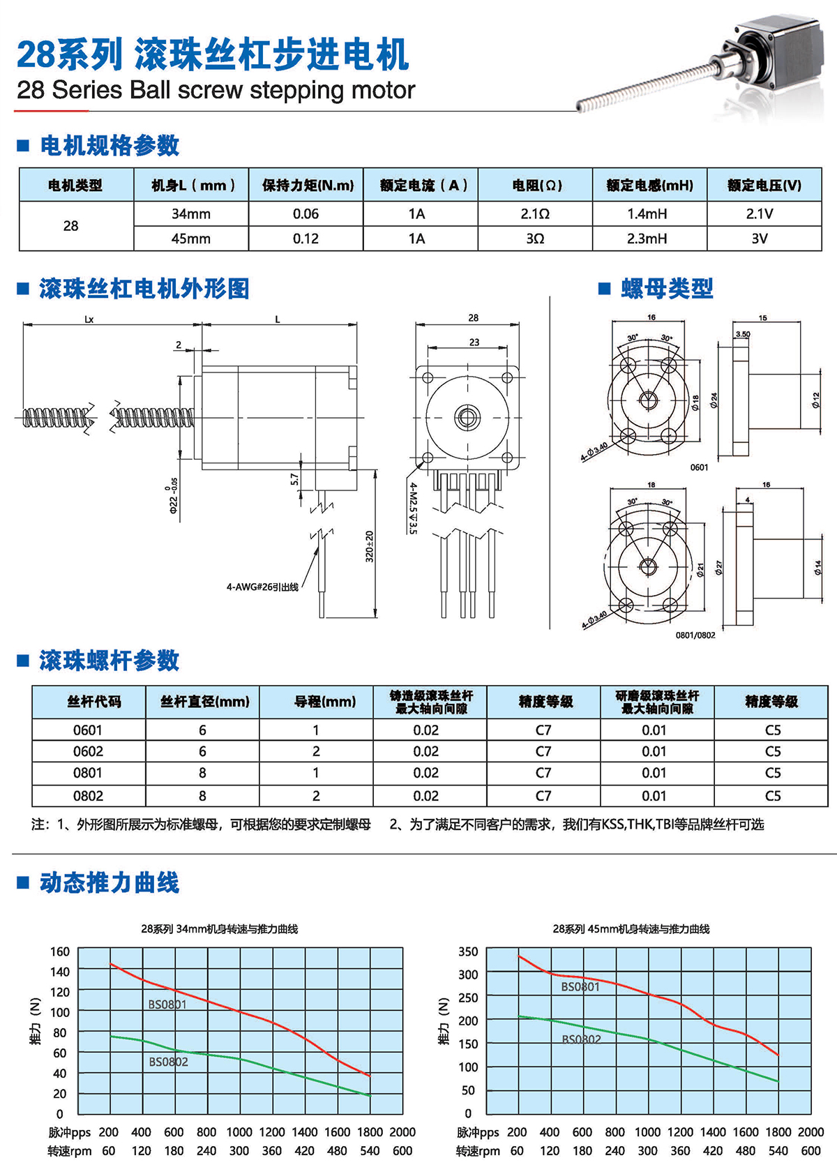 滚珠丝杆步进电机有六种尺寸,外形尺寸从14mm至86mm,滚珠丝杆电机为外部驱动式。 从0.005mm/步到0. 1mm/步,有多种步长可选。推力可达1600N,全系可 选配编码器。