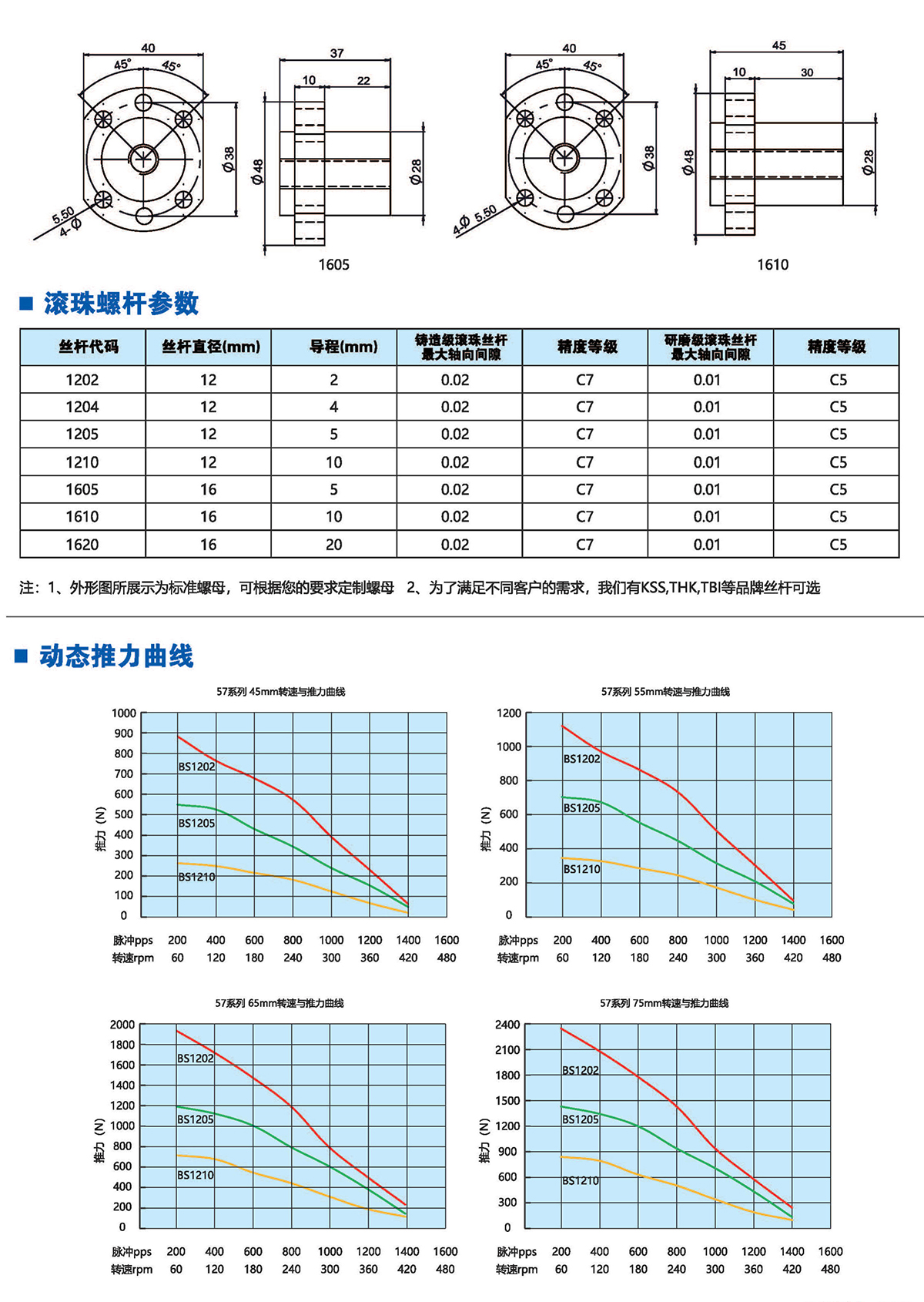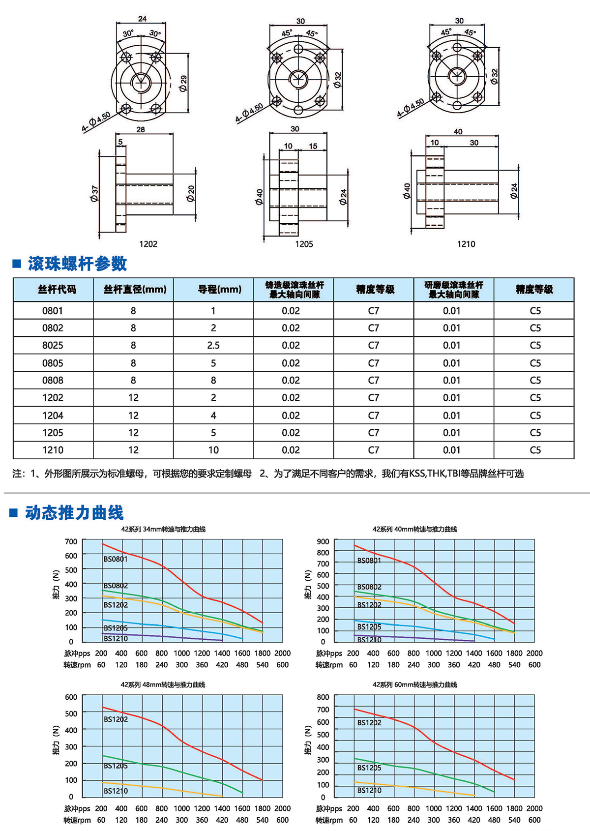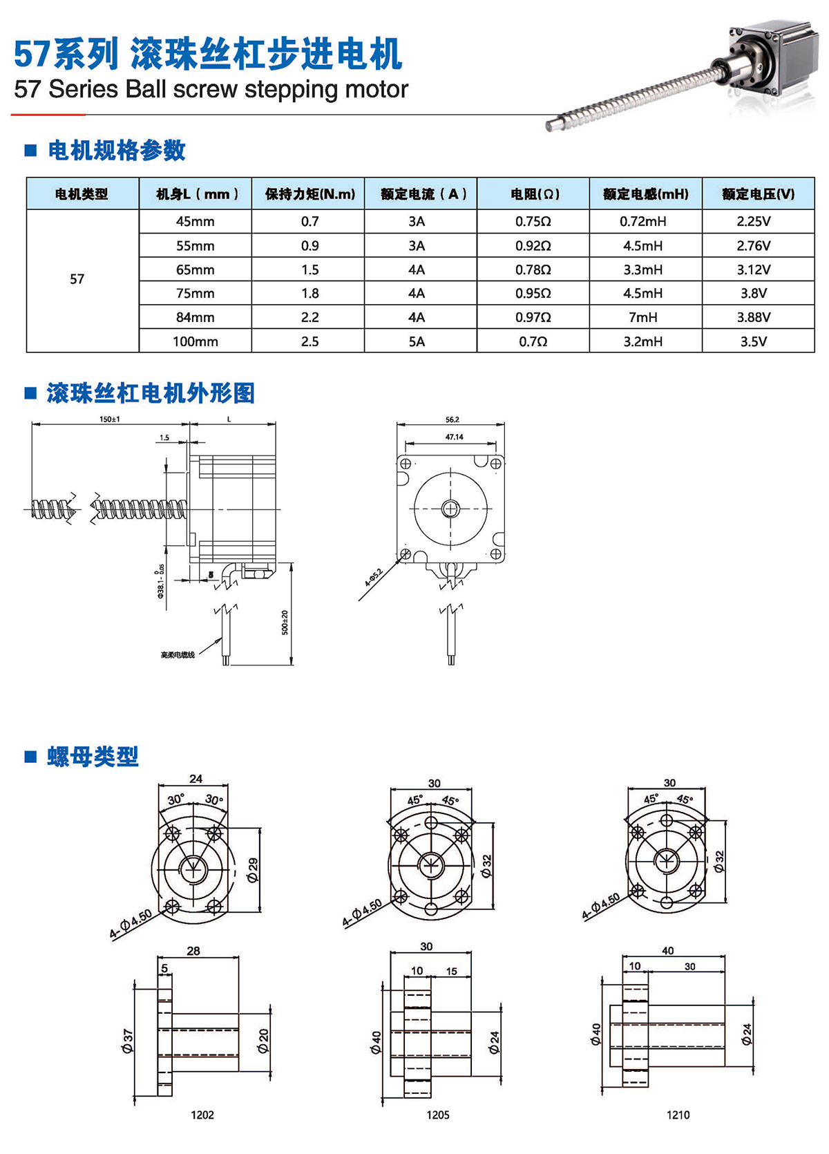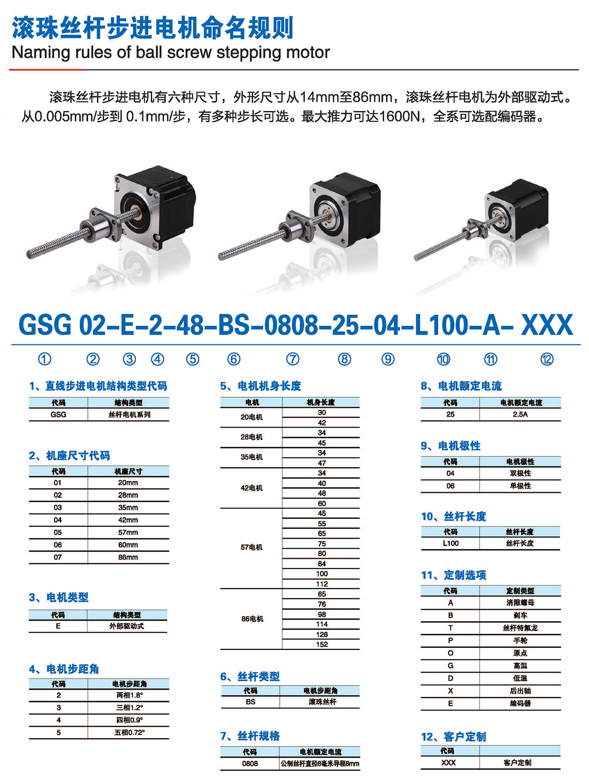 滚珠丝杆步进电机有六种尺寸,外形尺寸从14mm至86mm,滚珠丝杆电机为外部驱动式。 从0.005mm/步到0. 1mm/步,有多种步长可选。推力可达1600N,全系可 选配编码器。