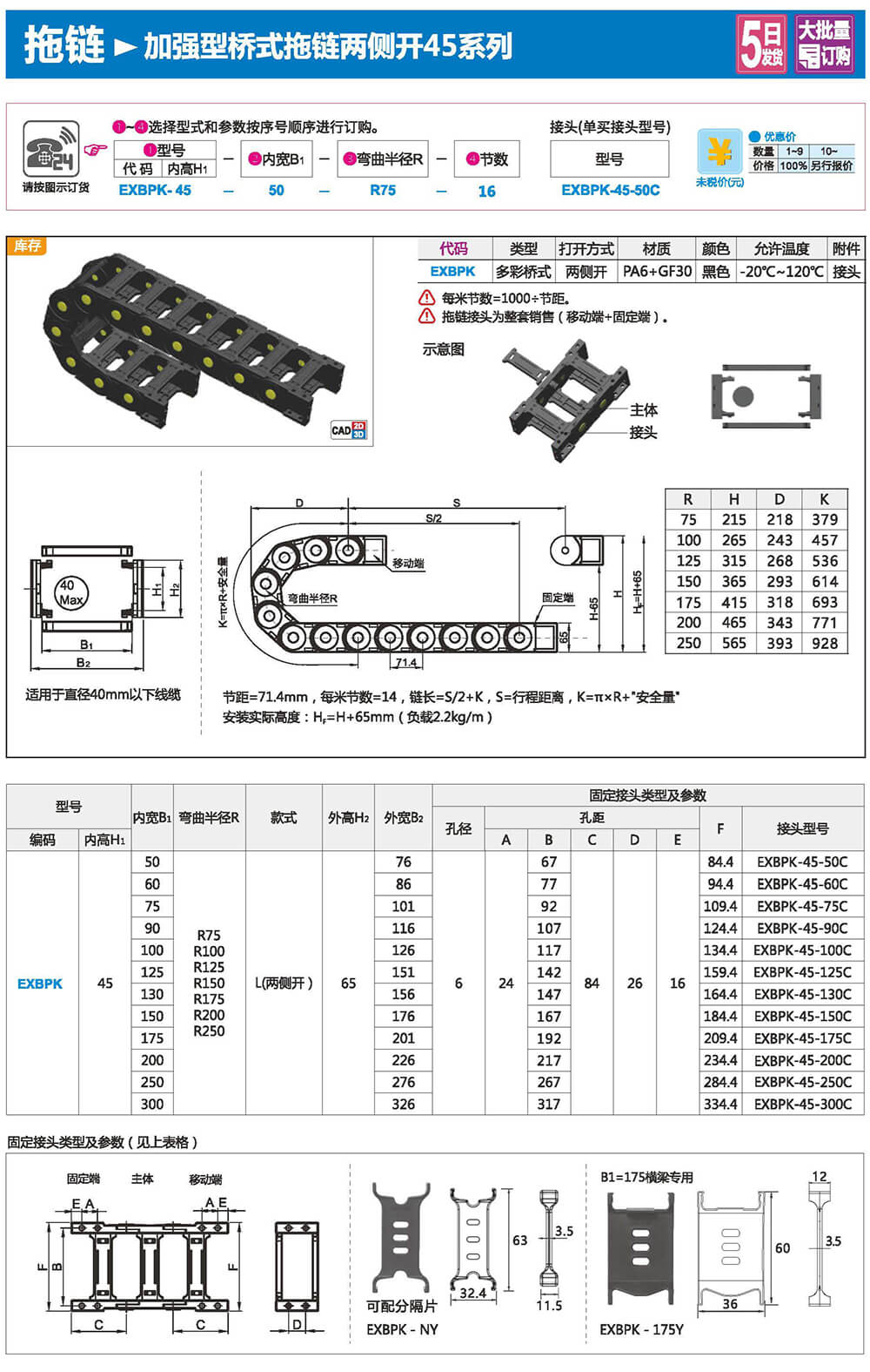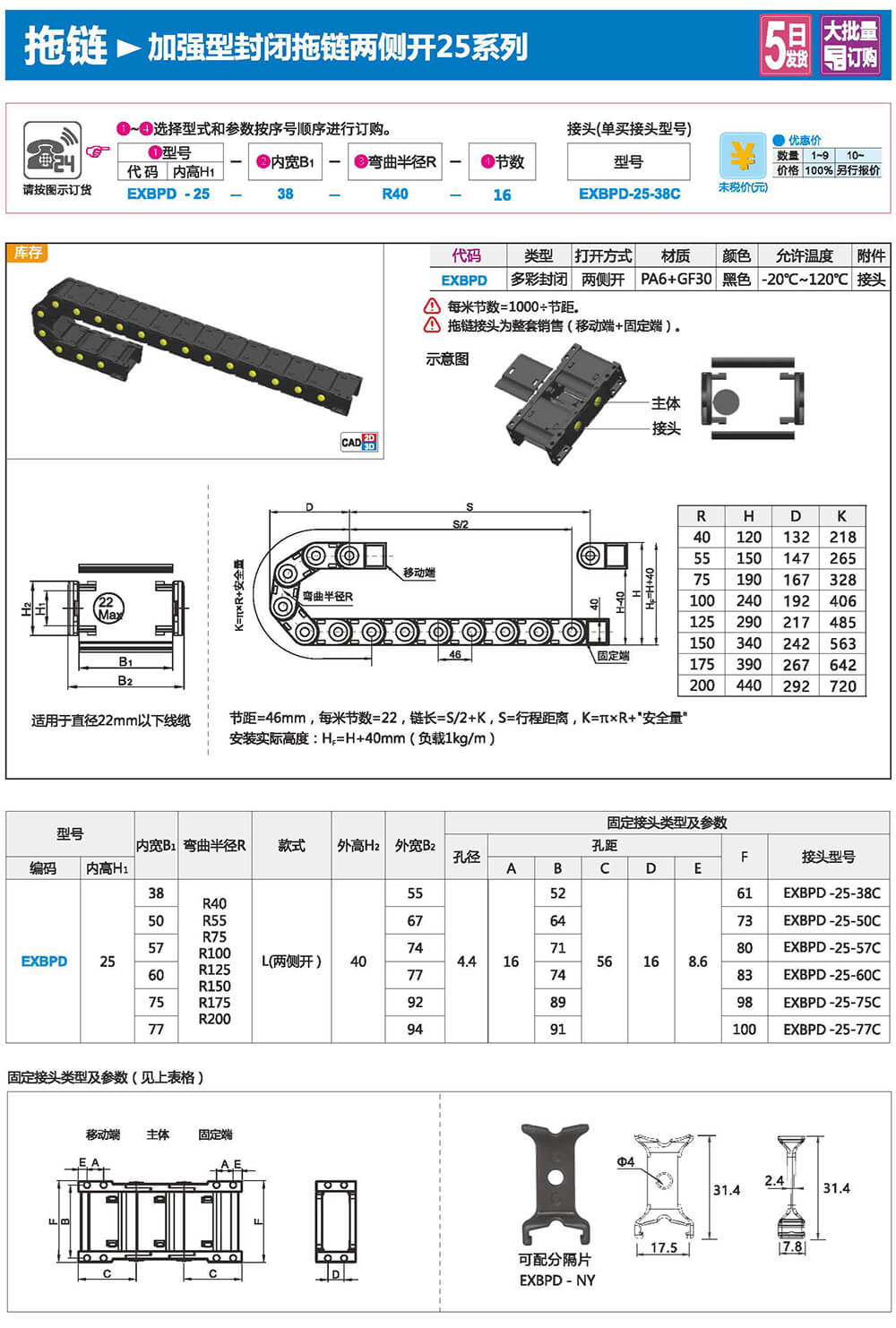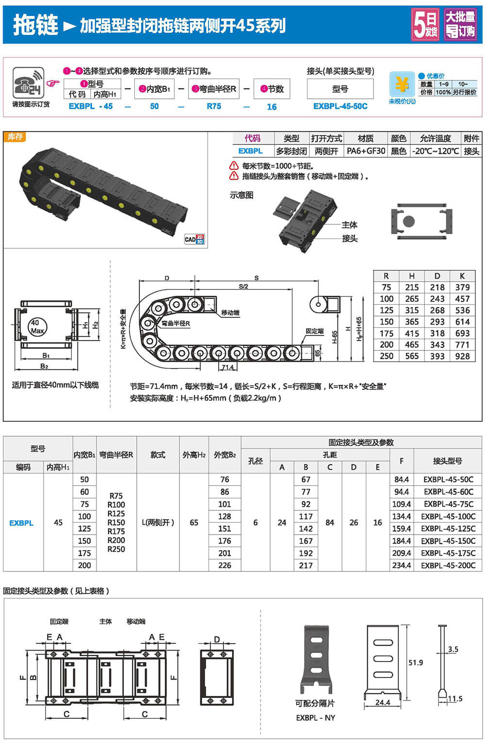 适合于使用在往复运动的场合,能够对内置的电缆、油管、气管、水管等起到牵引和保护作用,拖链每节都能打开,便于安装和维修。运动时噪音低、耐磨、可高速运动。拖链已被广泛应用于数控机床.电子设备、石材机械、玻璃机械、门窗机械、注塑机、机械手、起重运输设备、自动化仓库等。