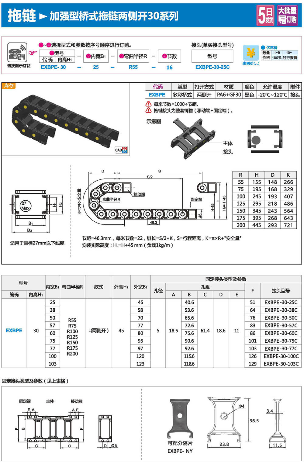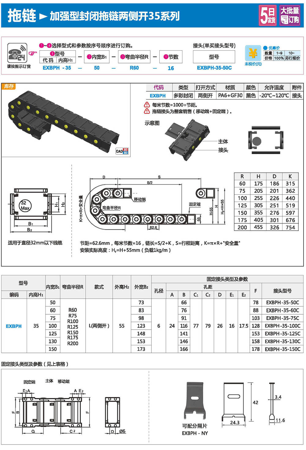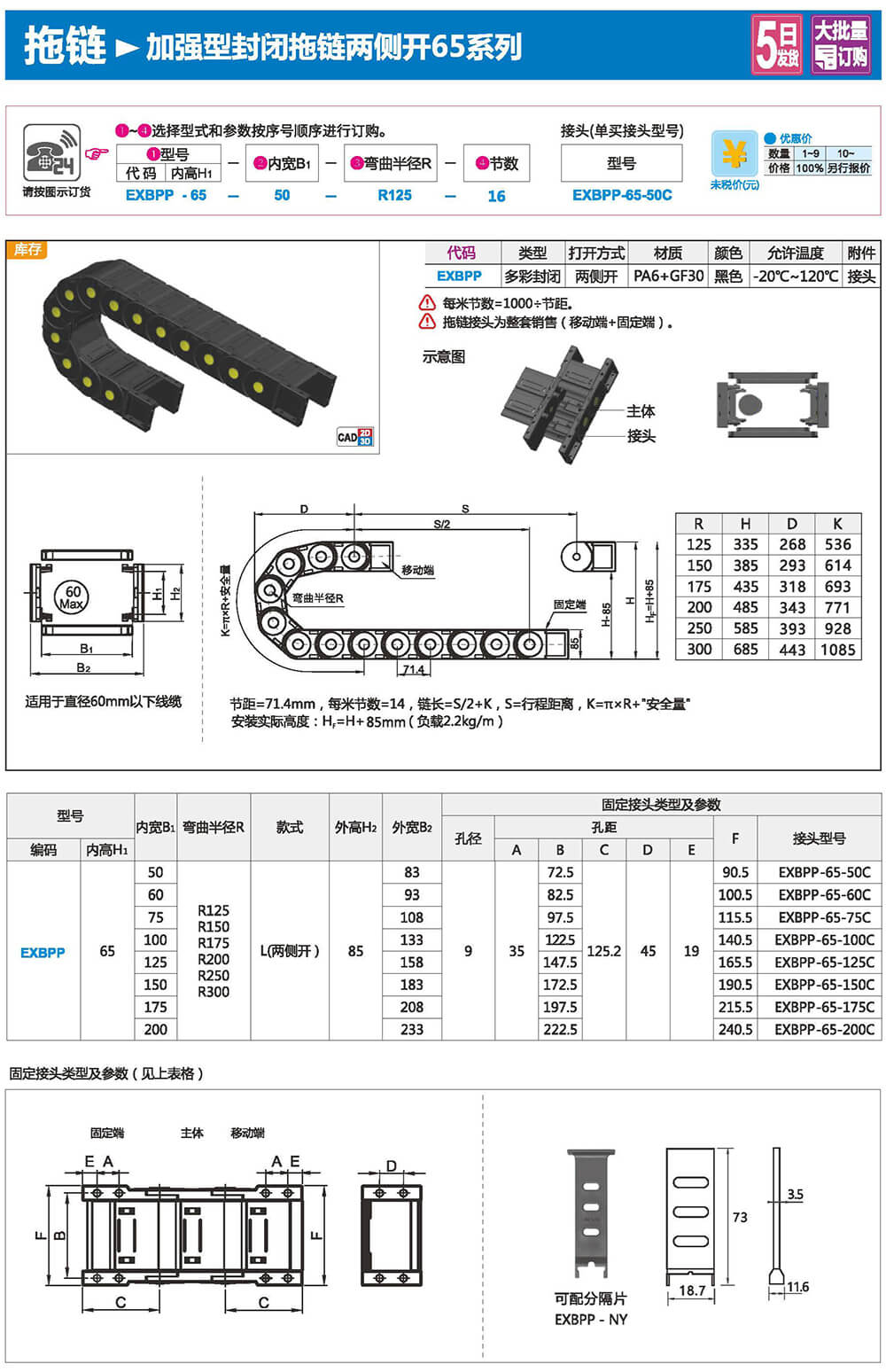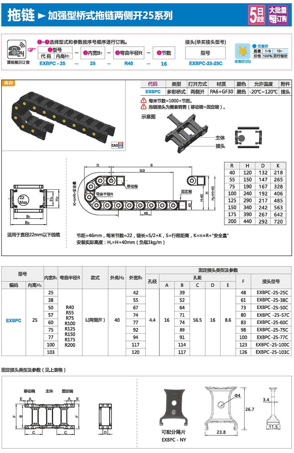 适合于使用在往复运动的场合,能够对内置的电缆、油管、气管、水管等起到牵引和保护作用,拖链每节都能打开,便于安装和维修。运动时噪音低、耐磨、可高速运动。拖链已被广泛应用于数控机床.电子设备、石材机械、玻璃机械、门窗机械、注塑机、机械手、起重运输设备、自动化仓库等。
