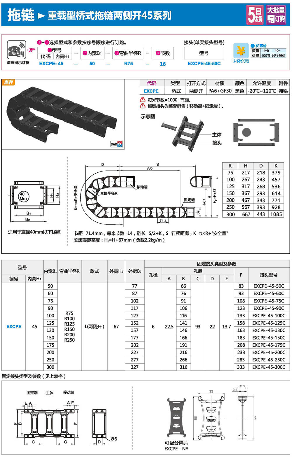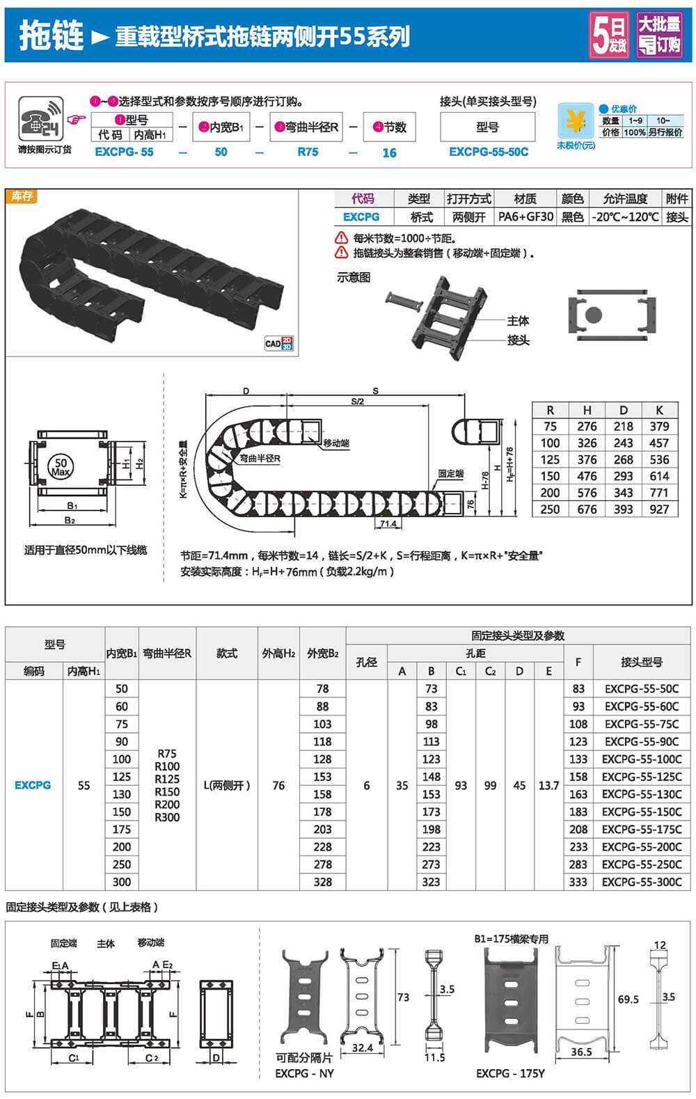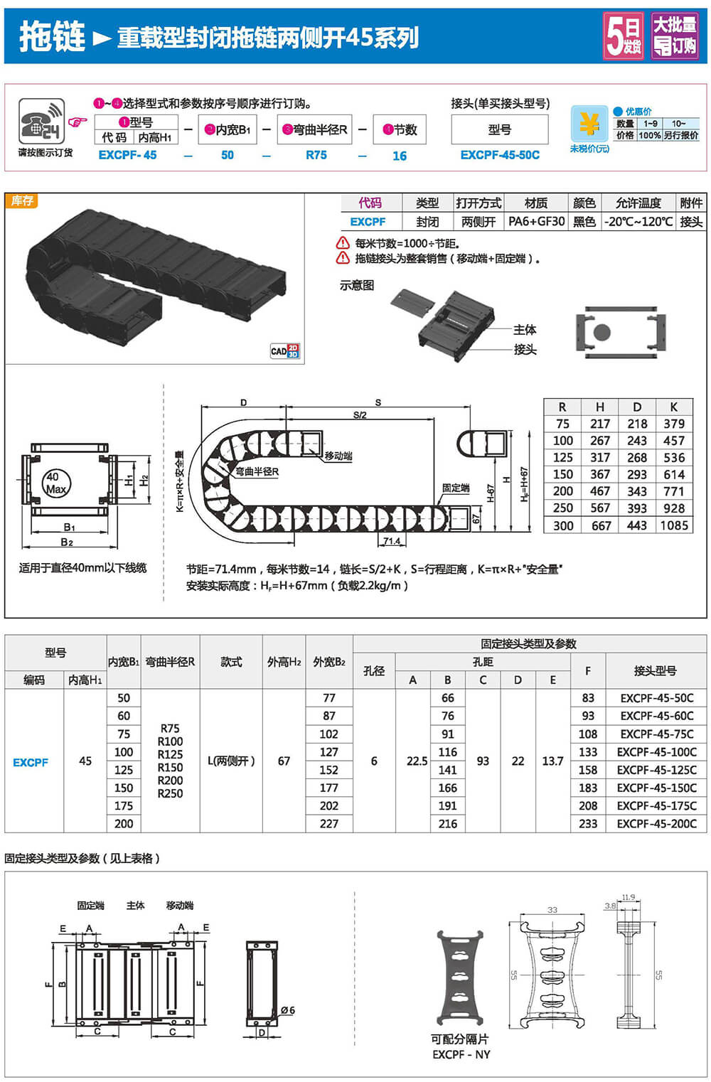 适合于使用在往复运动的场合,能够对内置的电缆、油管、气管、水管等起到牵引和保护作用,拖链每节都能打开,便于安装和维修。运动时噪音低、耐磨、可高速运动。拖链已被广泛应用于数控机床.电子设备、石材机械、玻璃机械、门窗机械、注塑机、机械手、起重运输设备、自动化仓库等。