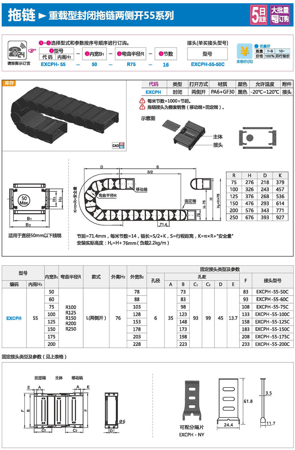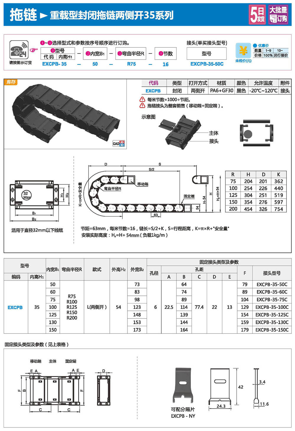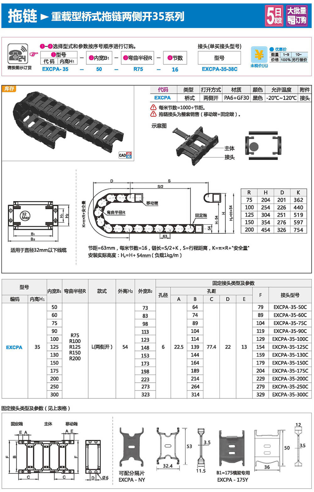 适合于使用在往复运动的场合,能够对内置的电缆、油管、气管、水管等起到牵引和保护作用,拖链每节都能打开,便于安装和维修。运动时噪音低、耐磨、可高速运动。拖链已被广泛应用于数控机床.电子设备、石材机械、玻璃机械、门窗机械、注塑机、机械手、起重运输设备、自动化仓库等。