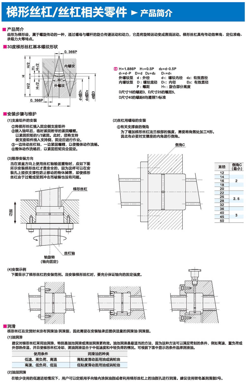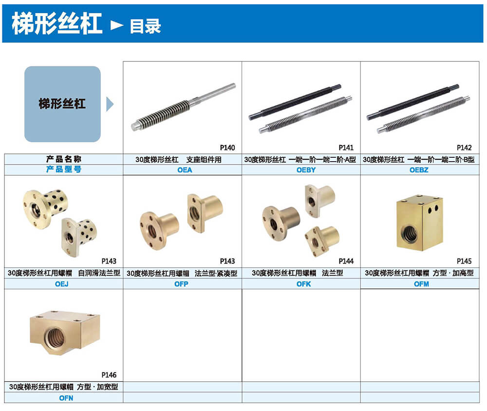 齿形为梯形齿,属于螺旋传动的一种, 通过螺母与螺杆的旋合传递运动和动力,它是将旋转运动变成直线运动。梯形丝杠具有传动效事高、定位准确、承载力大等特点。