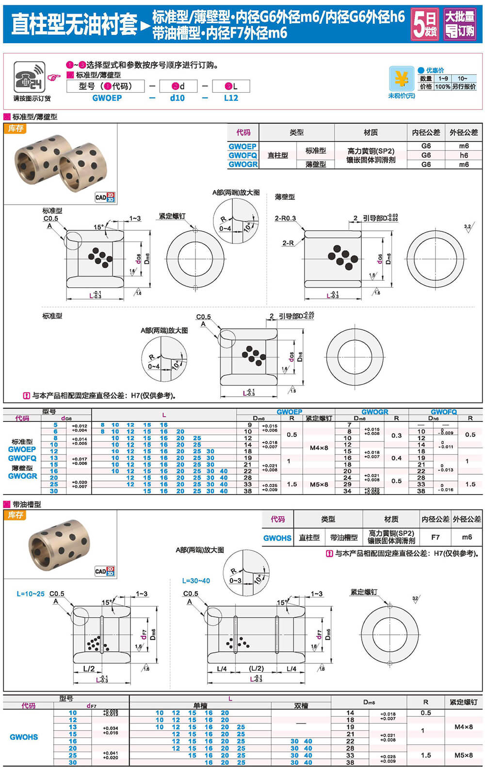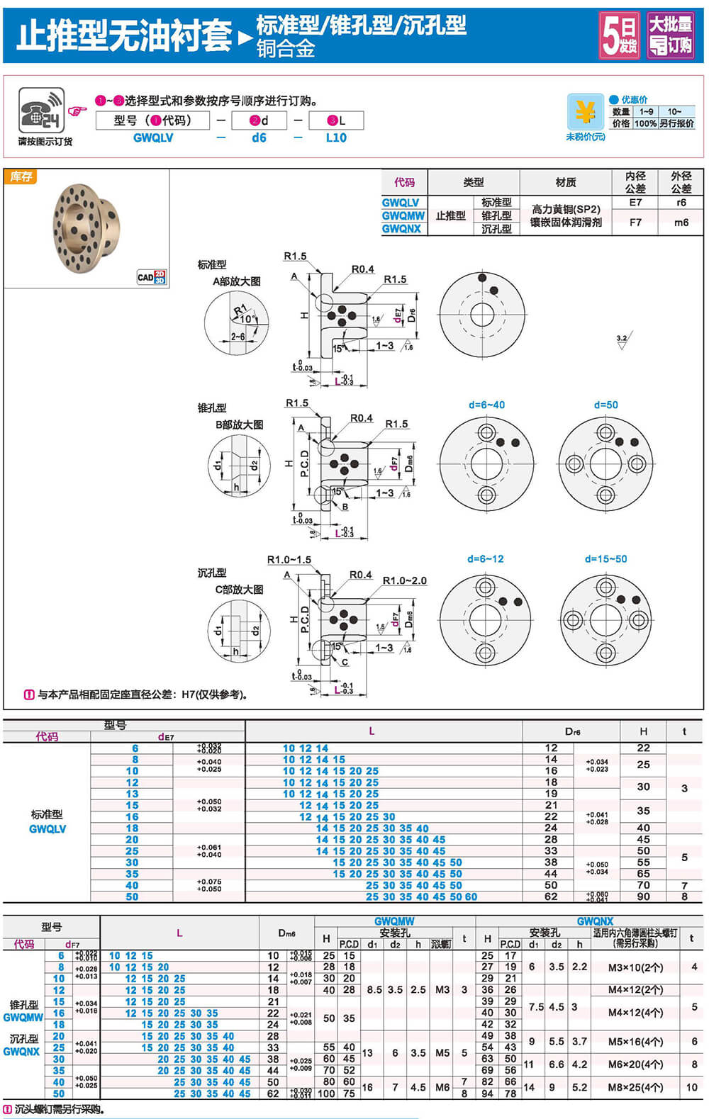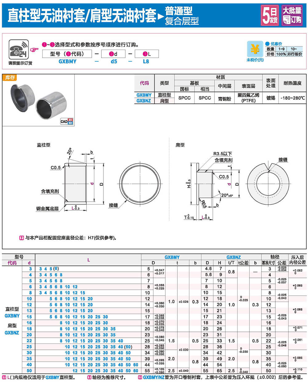 又称为自润滑轴承,是-一种兼有金属轴承特点和无油润滑轴承特点的新颖润滑轴承,由金属基体承受载荷,特殊配方的固体润滑材料起润滑作用。它具有承载能力高,耐冲击,耐高温,自润滑能力强等特点,特别适用于重载,低速,往复或摆动等难以润滑和形成油膜的场合,也不怕水冲和其它酸液的浸蚀和冲刷。目前产品已广泛应用在冶金连铸机、轧刚设备、矿山机械、模具,起重机械.纺织机械、风电发电、船舶、汽轮机、水轮机、注塑机及设备生产流水线中。