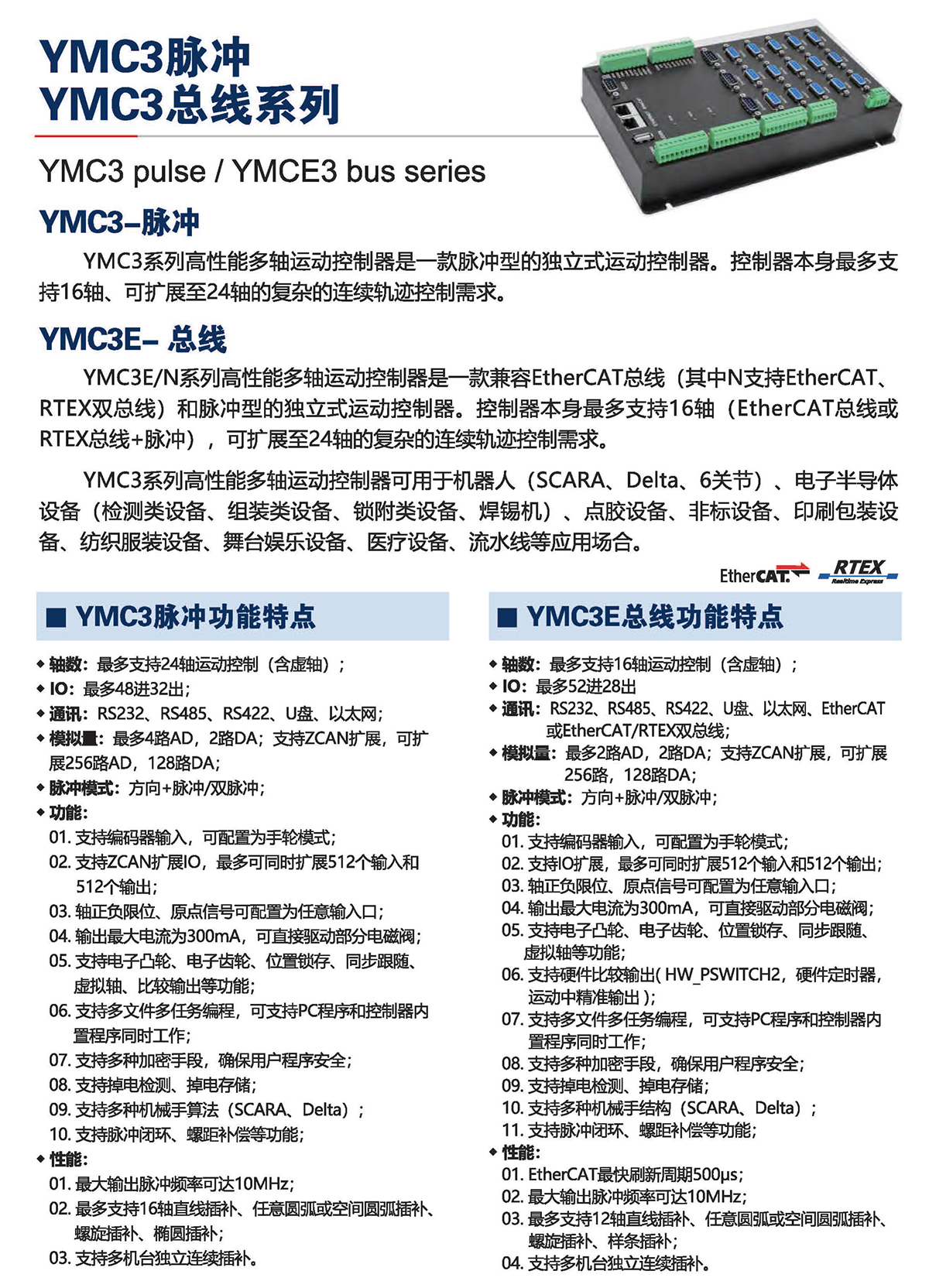 YMC3系列高性能多轴运动控制器是一款脉冲型的独立式运动控制器。 控制器本身最多支持16轴、可扩展至24轴的复杂的连续轨迹控制需求。