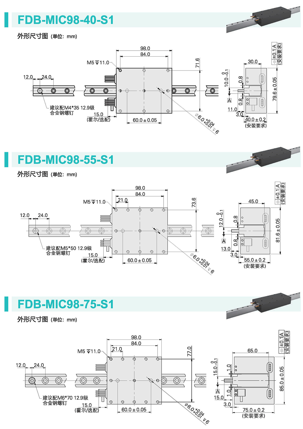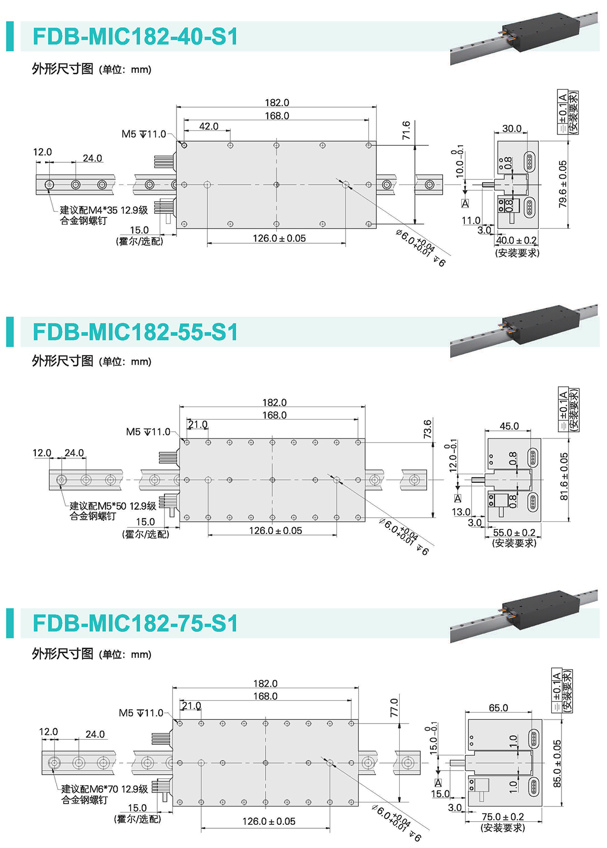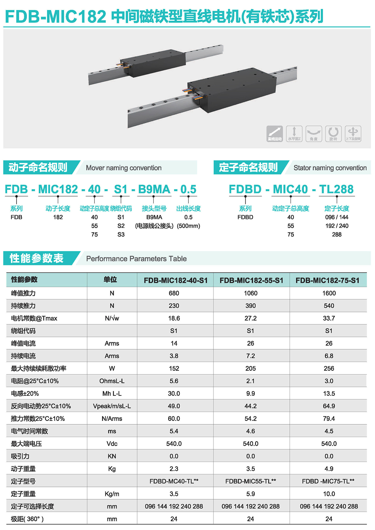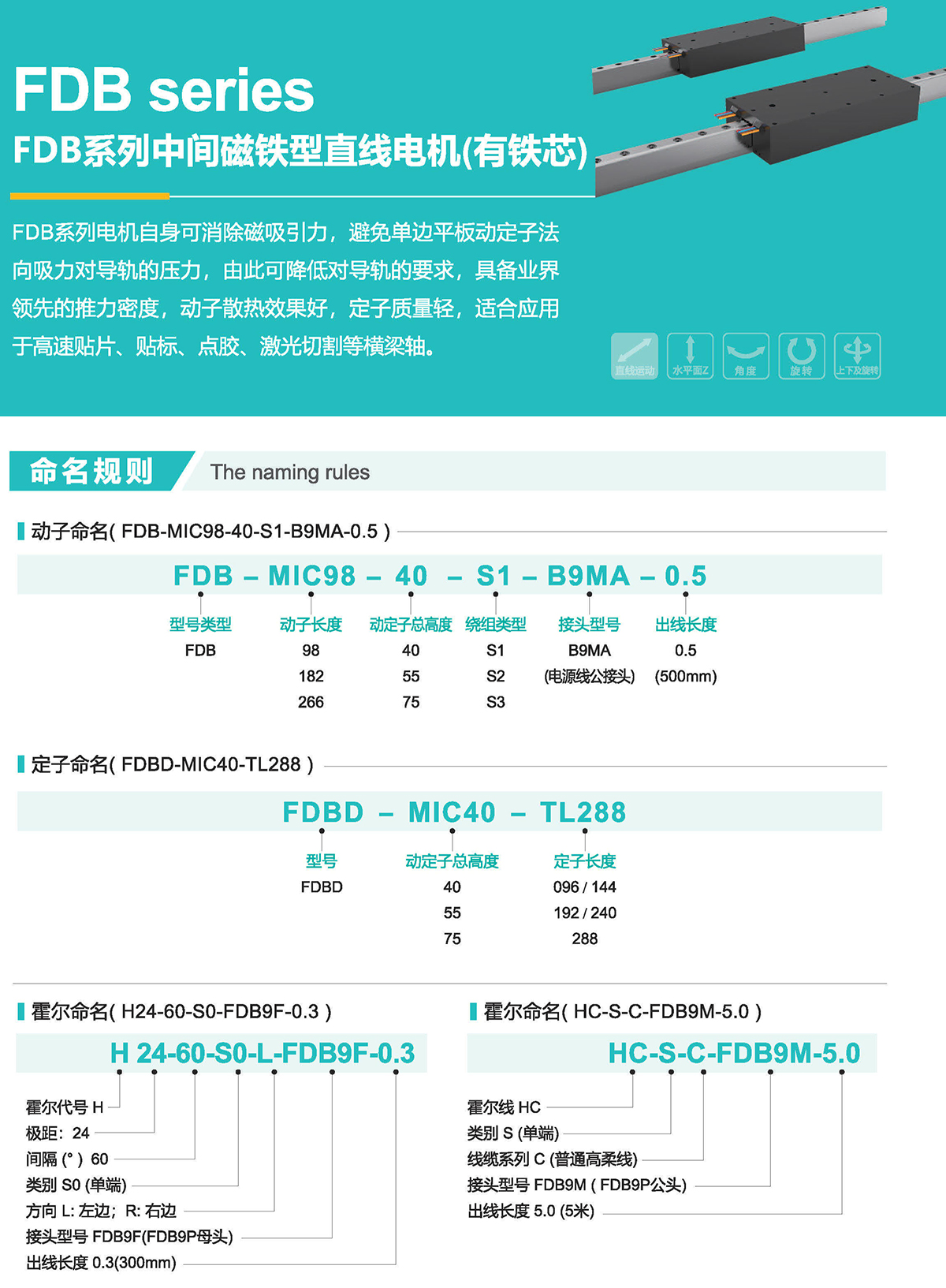 FDB系列电机自身可消除磁吸引力,避免单边平板动定子法向吸力对导轨的压力,由此可降低对导轨的要求,具备业界领先的推力密度,动子散热效果好,定子质量轻,适合应用于高速贴片、贴标、点胶、激光切割等横梁轴。