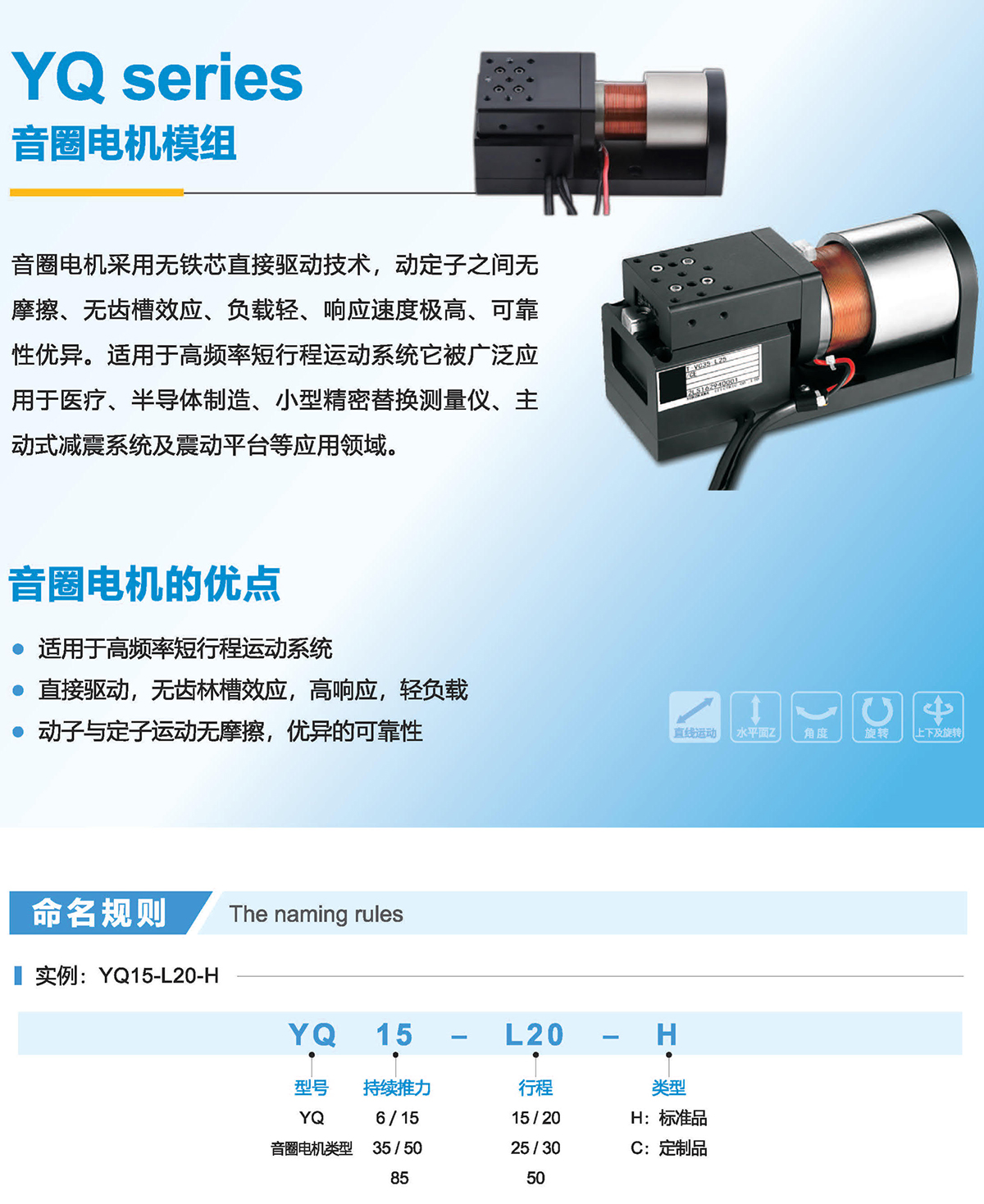 音圈电机采用无铁芯直接驱动技术,动定子之间无摩擦、无齿槽效应、负载轻、响应速度极高、可靠性优异。适用于高频率短行程运动系统它被广泛应用于医疗、半导体制造、小型精密替换测量仪、主动式减震系统及震动平台等应用领域。