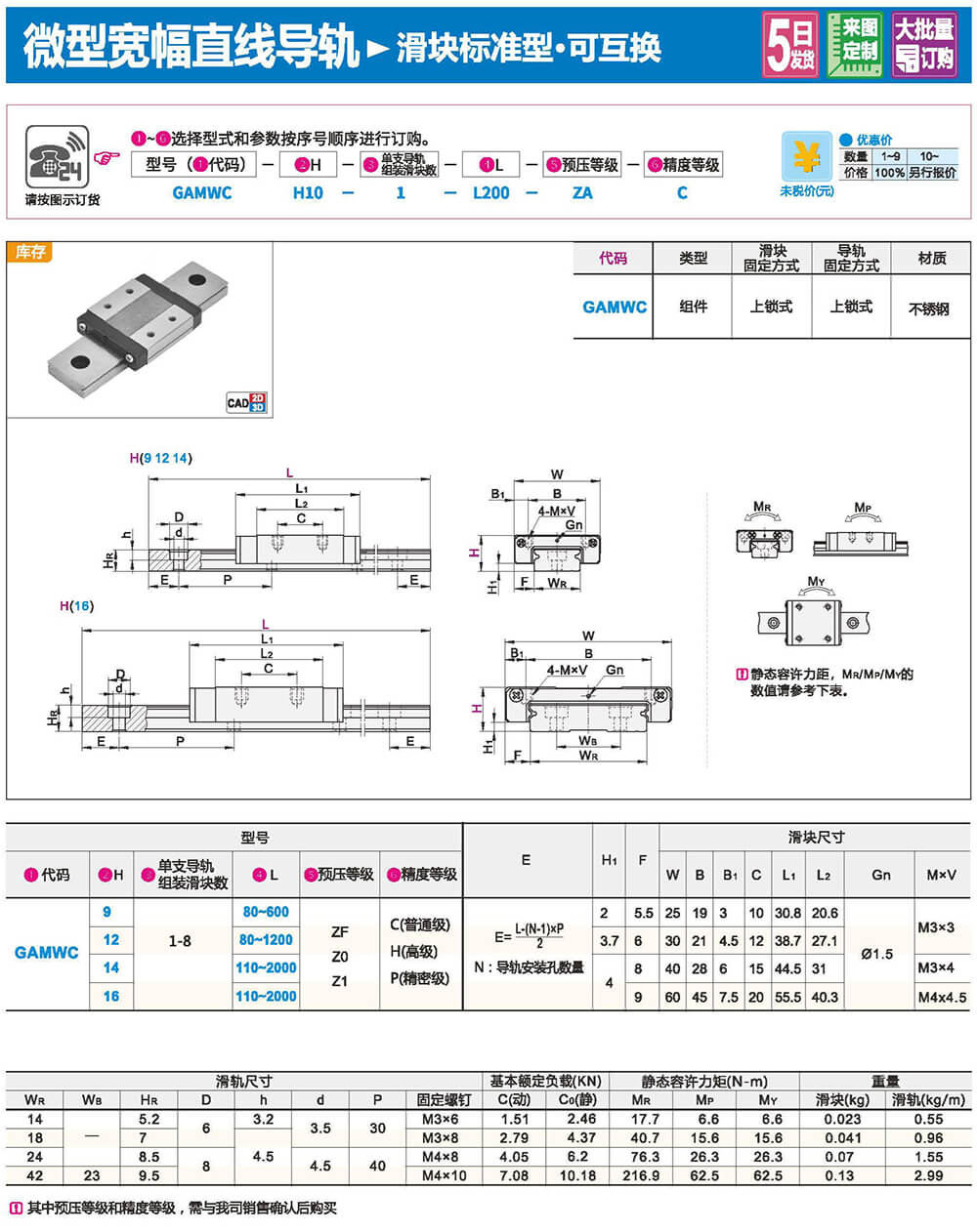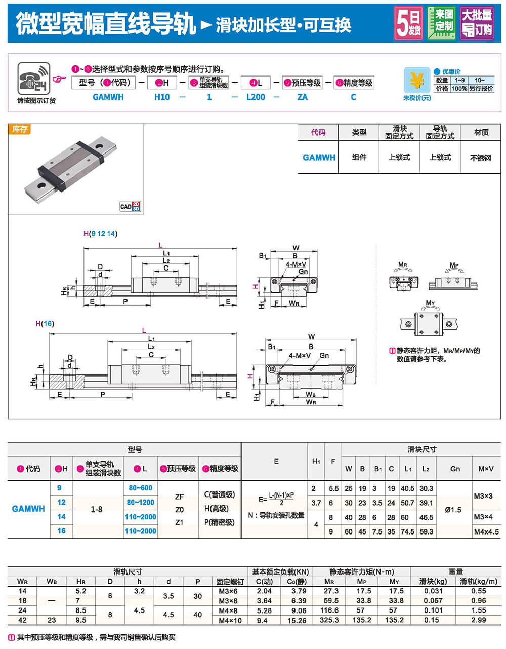 直线导轨由钢珠在滑块与滑轨之间作无限滚动循环负载平台能沿着滑轨轻易地以高精度做线性运动。与传统的滑动导引相比较滚动引导的摩擦系数可降低至1/50,由于启动的摩擦力大大减少,相对的较少无效运动发生故而能轻易达到μum级进给及定位。在加上滑块与滑轨的束制单元设计,使得线性导轨可同时承受上下左右等各个方向的负荷上述陈列特点并非传统滑动导引所能比拟因此机台若能配合滚珠螺杆,使用线性导轨作导引必能大幅提高设备精度与机械效能。