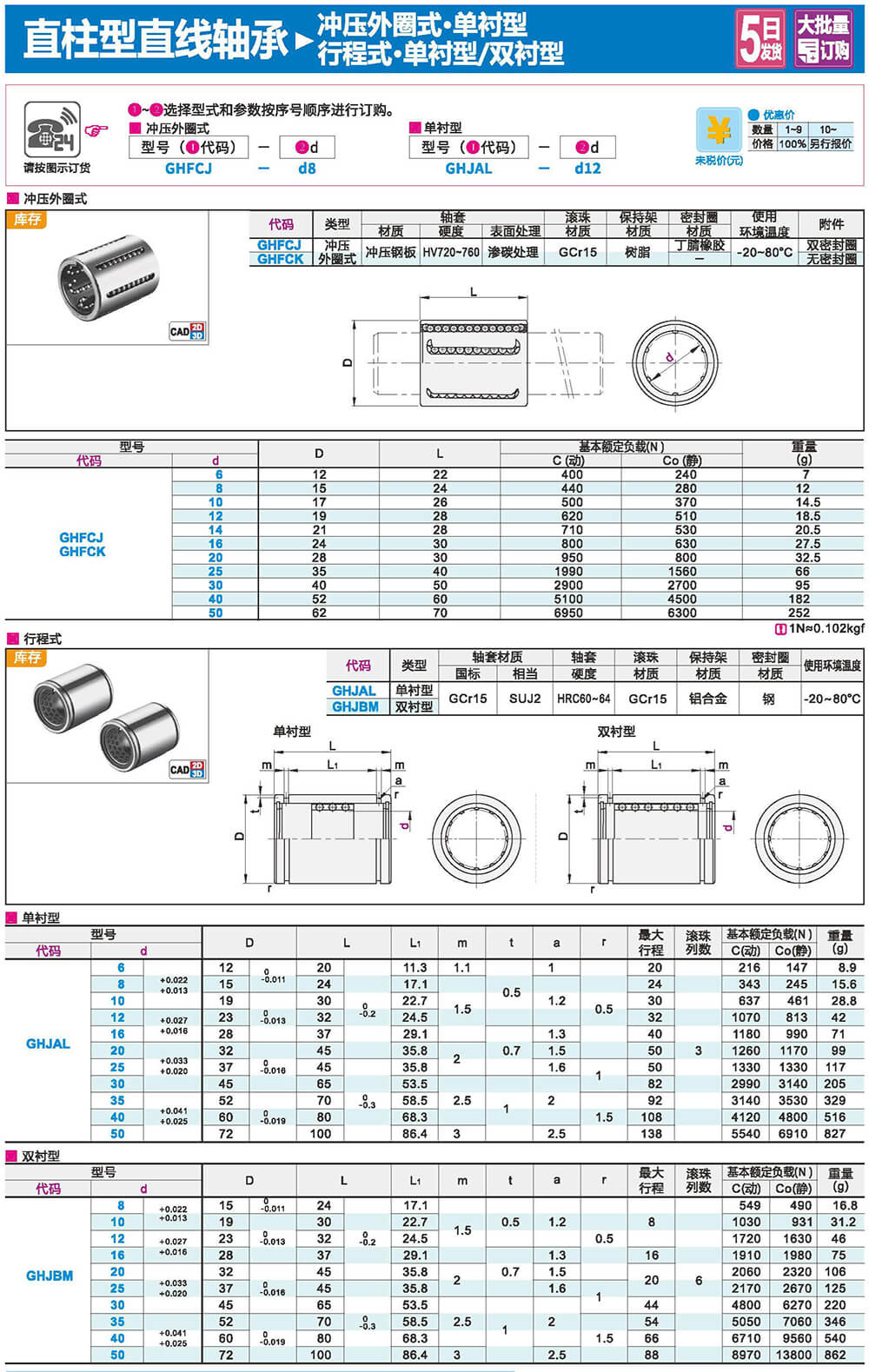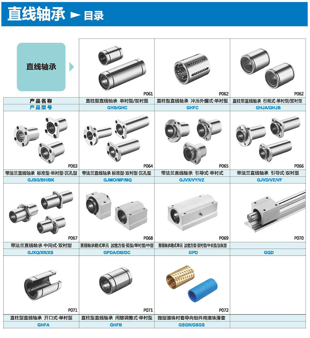 是一种低成本的直线运动系统,用于无限行程与圆柱轴配合使用。由于承载球与轴为点接触,故使用载荷小。钢球以极小的摩擦阻力旋转,从而能获得高精度的平稳运动。
