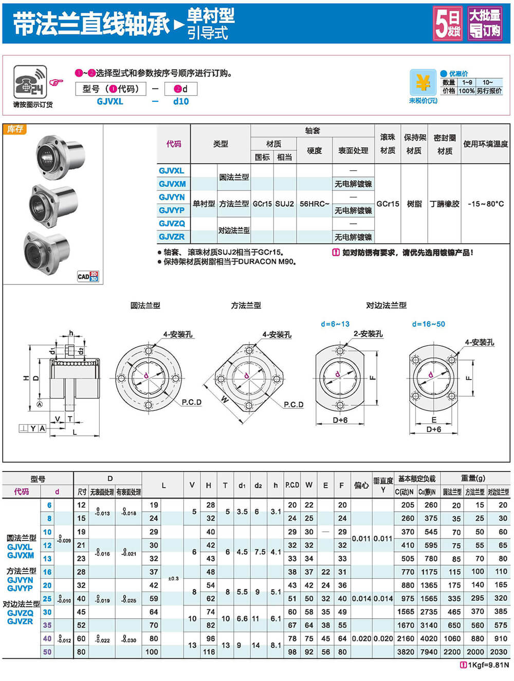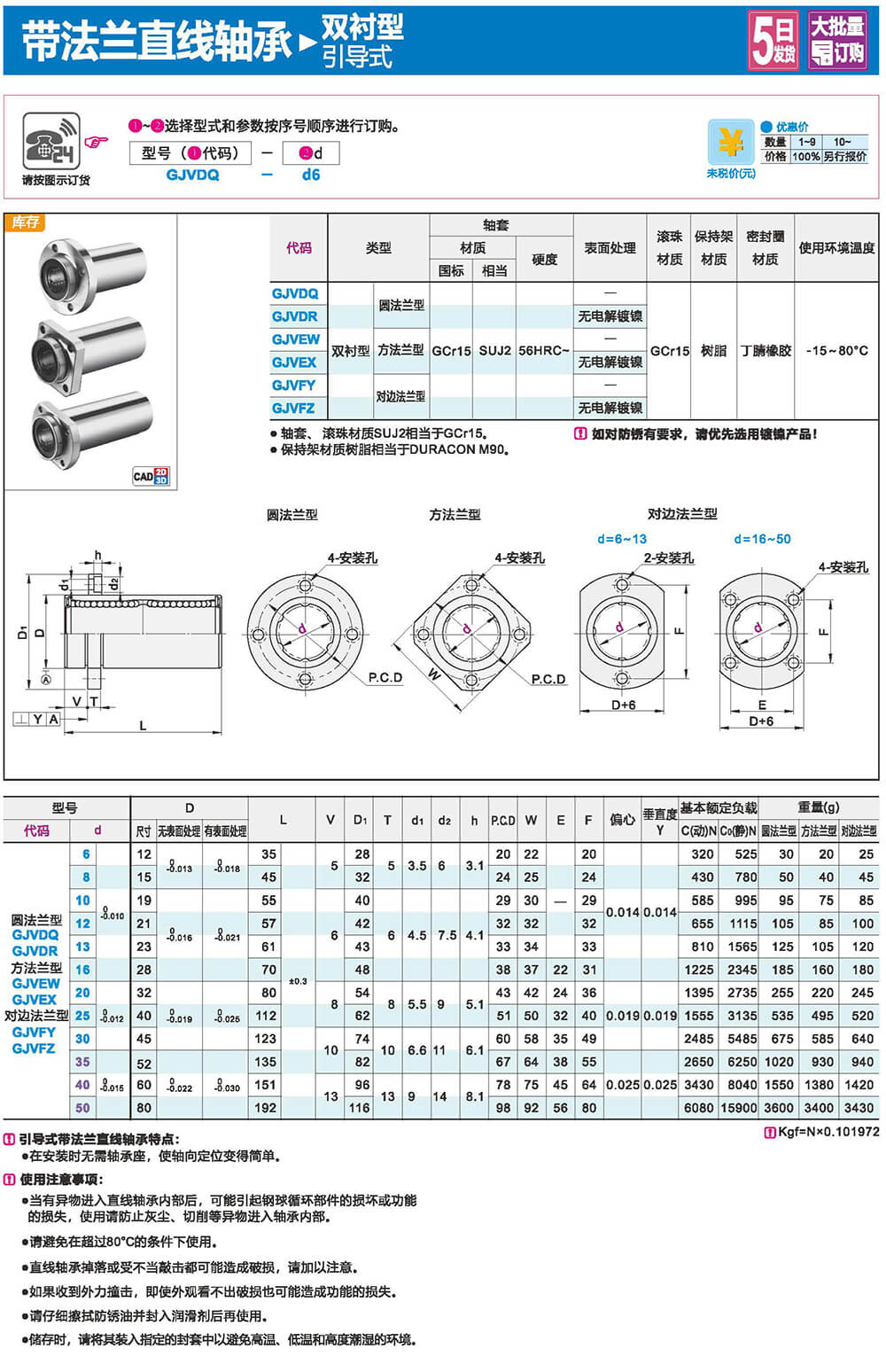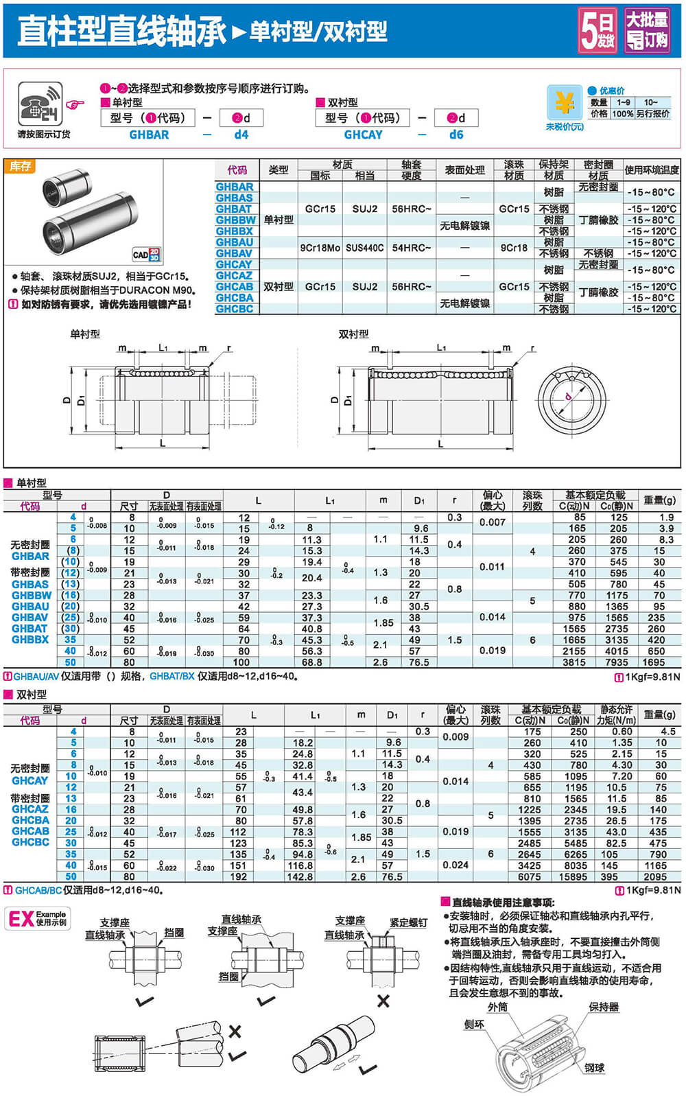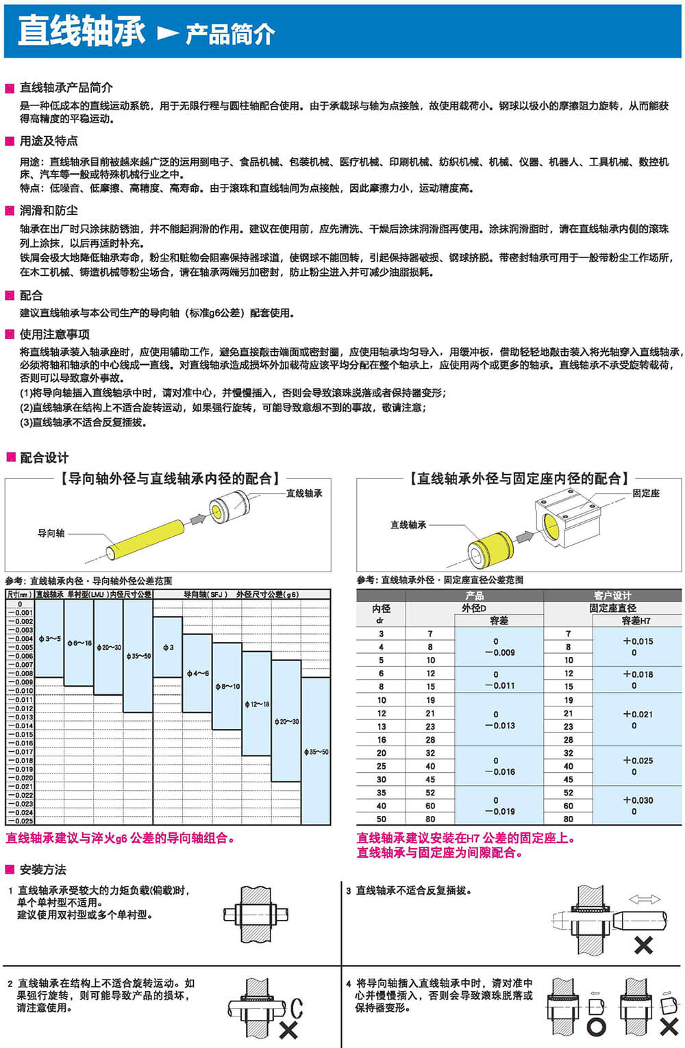特点:低噪音、低摩擦、高精度、高寿命。由于滚珠和直线轴间为点接触,因此摩擦力小,运动精度高。